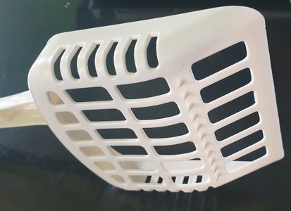 Łopatka przeznaczona do wybierania zbrylonego peletu z kuwety. Posiada duże otwory przez które łatwo przelatuje niezbrylony pelet, co bardzo ułatwia przesianie. Jeśli ktoś stosuje kruszon lub piasek, to poradzi sobie praktycznie każdą łopatką do kuwety, jednak do peletu potrzebna jest z większymi otworami. Łopatka wykonana z tworzywa sztucznego, posiada ząbki od spodu do zdrapywania przyklejonego do dna kuwety materiału.